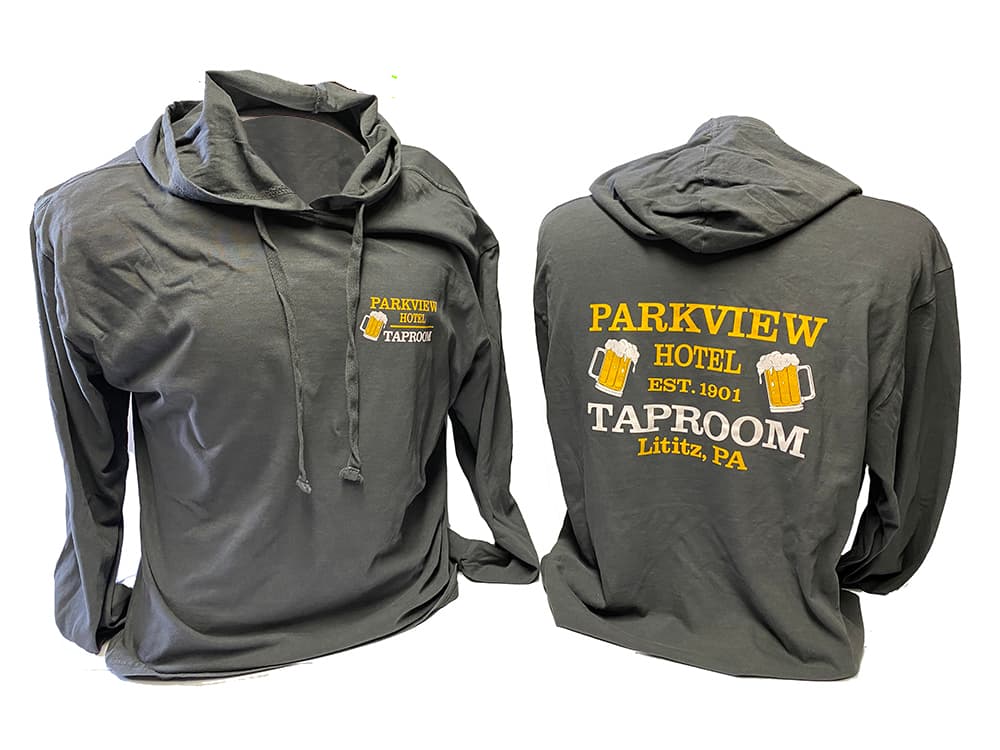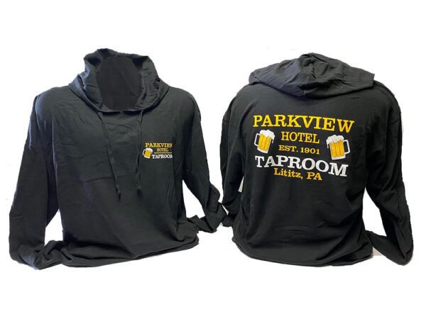 Long sleeve hooded cotton t-shirt with screen-printed Parkview Hotel Taproom logo on both front and back. Available in adult sizes: M, L, XL and 2X. *2X sizes include a small upcharge.